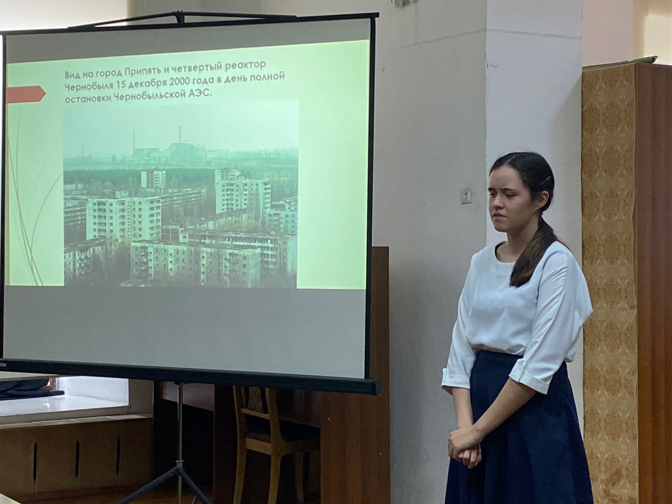 Урок также затронул экологическую сторону катастрофы, вызванную взрывом Чернобыльской станции. В результате аварии произошло радиоактивное загрязнение територий, прилегающих к атомной станции. В исполнении Будиной Ирины (Юр-25-1), Кургузовой Марины, Бадаевой Дарьи, Емельяновой Виктории, эмоционально прозвучали стихи, которые передали трагедию Чернобыля, описывая "коричневый рассвет", мертвую тишину Припяти и боль утраты родной земли. Больные дети - ещё одна печальная страница этой истории. Учёные предупреждают, что территория Припяти и Чернобыля останется непригодной для жизни ещё тысячи лет. Человек и природа - это единое целое, и наша ответственность заключается в том, чтобы беречь эту связь.