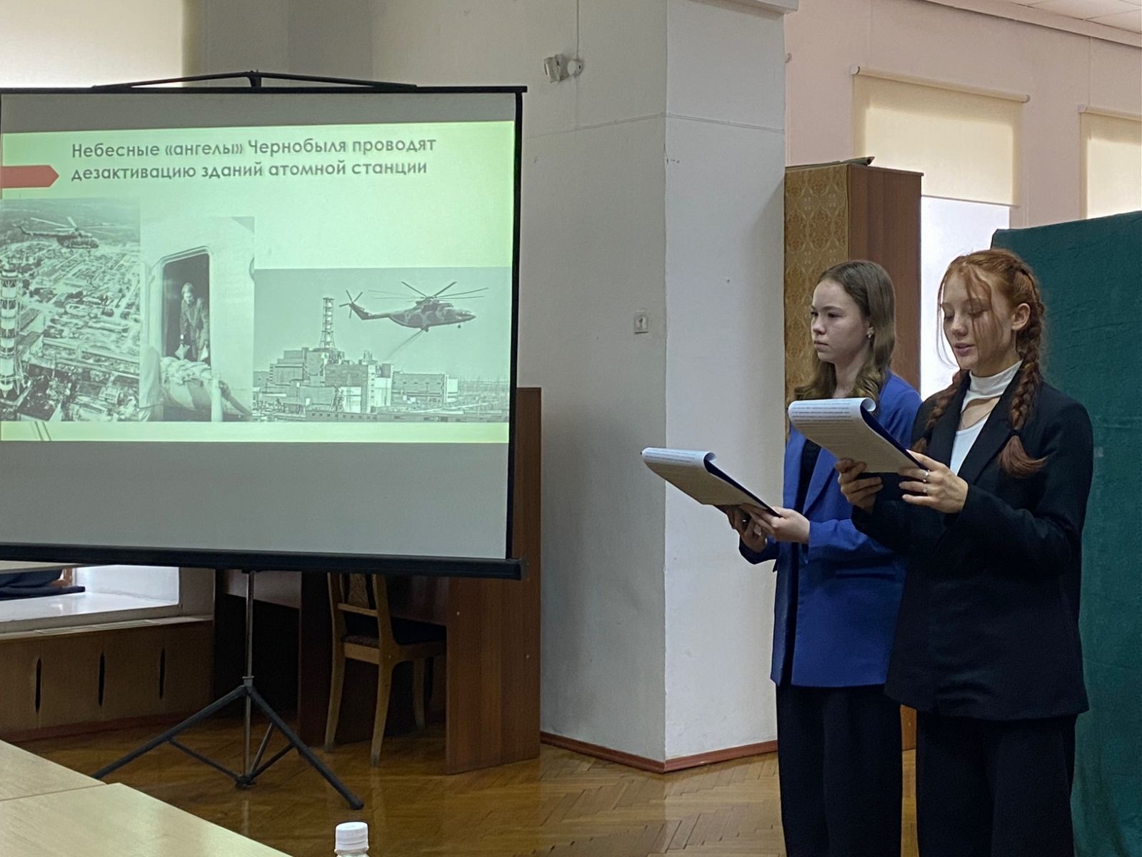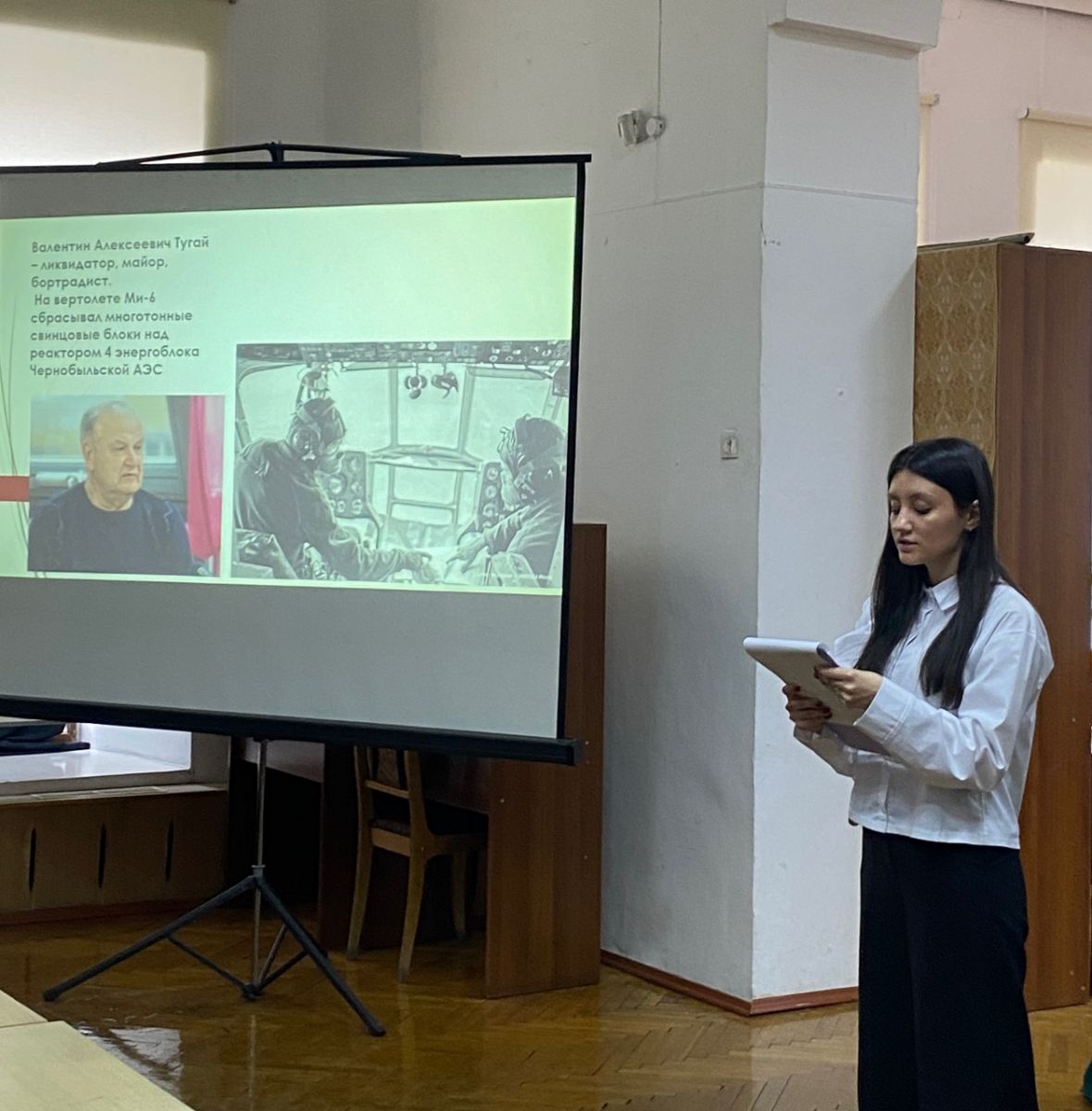 Ведущие мероприятия - Жбанчикова Мария и Линейцева Дарья (Юр-25-1) рассказали о героях, которые стояли на передовой борьбы с атомной стихией. Это пожарные, армия, спасатели, врачи, вертолётчики, добровольцы, стали настоящими свидетелями и участниками исторических событий, многие из них до сих пор сталкиваются с последствиями радиационного воздействия. Эти люди не называли себя героями, но то, что они сделали - истинный героизм.