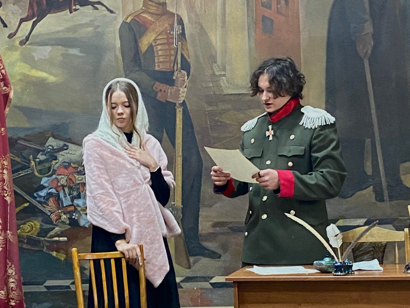 Торжественно и трогательно звучали в этот день слова ведущих Золочевской Алины и Новиковой Арины о декабристах, их женах и о самом восстании на Сенатской площади.