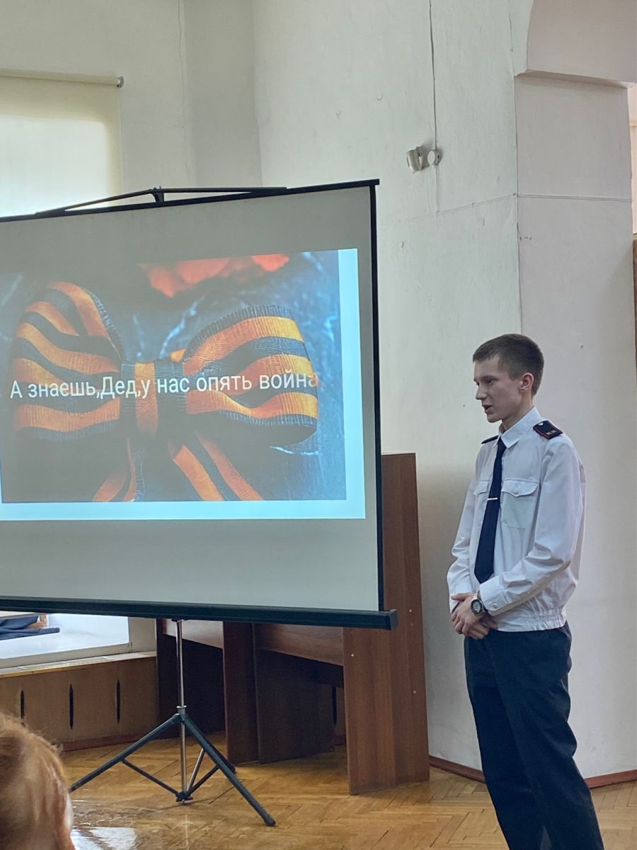 Зрителям были предложены песни «Россия моя», «Одного» исполнении Ковалевой Елизаветы (Юр-23-1) и песня «Кукушка» в исполнении Сиднева Ярослава (Кадетский класс).